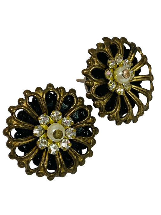 Retro Style Post Pierced Earrings Goldtone Black Beaded Rhinestones .8"