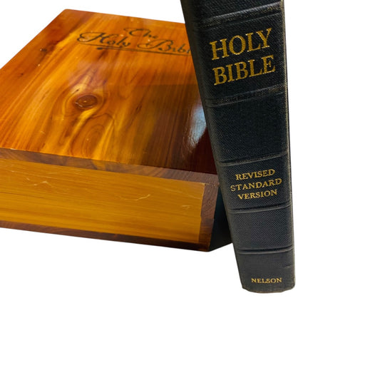 1950s Holy Bible in Hinged Cedar Box Revised Standard Nelson