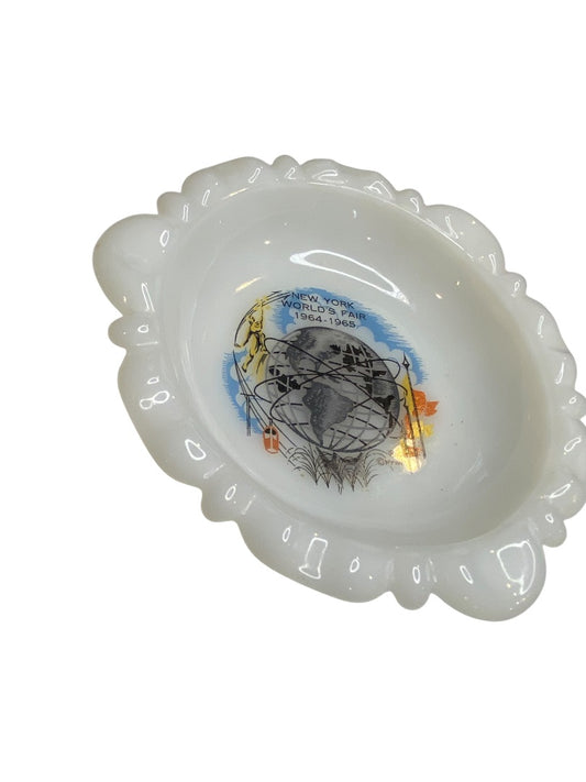 New York Worlds Fair Commemorative Ashtray Milk Glass 5.5"