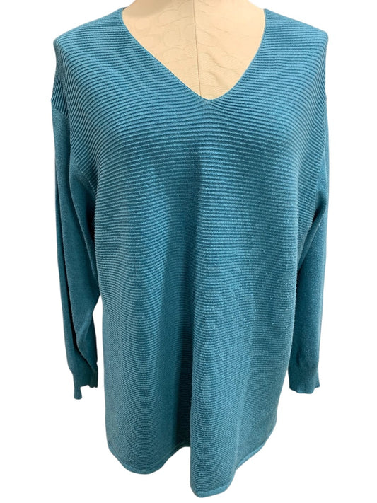 XL Ella Moss Womens V-Neck Sweater Teal Horizontal Ribbed Knit