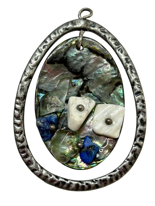 Reversible Pendant Mother of Pearl Silvertone Hammered 1.5"