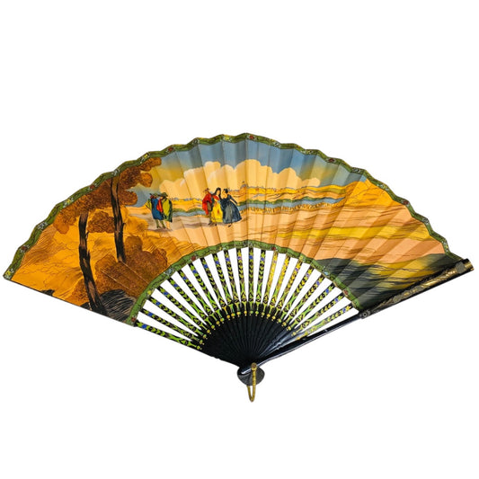 Vintage Hand Fan Vibrant Asian Paper Black Lacquer 10.5 Inch