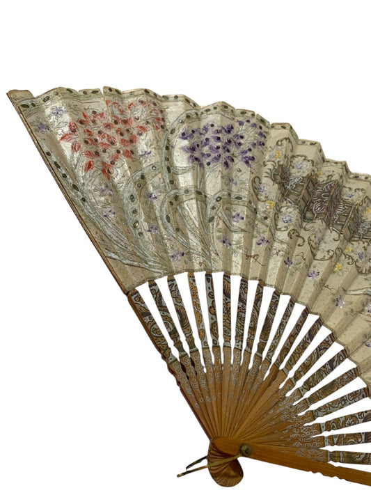 Vintage 9 Inch Hand Fan Asian Ornate Bamboo Ribs Painted Decor
