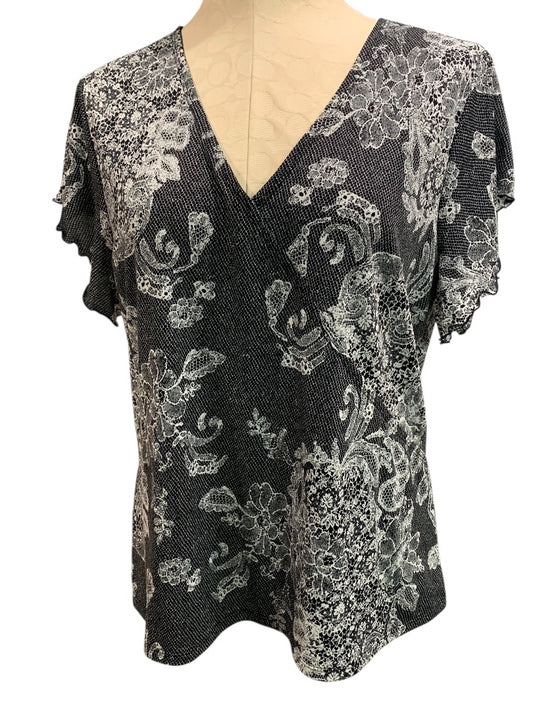 Large Laura Ashley Womens Lined V-Neck Shirt Lace Print Lined Black