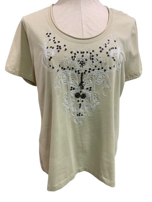 Large Laura Ashley Womens Tan Tshirt Embellished Embroidered Short Sleeve