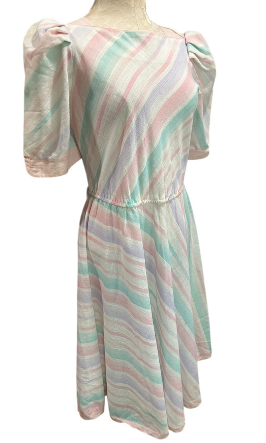 Size 10 Womens Dress Pastel Puff Sleeve Striped 80s Cottagecore