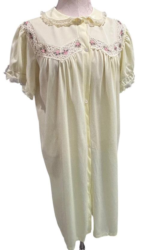 Vintage Nylon Robe Peignoir Butter Yellow Floral Lace Short Sleeve