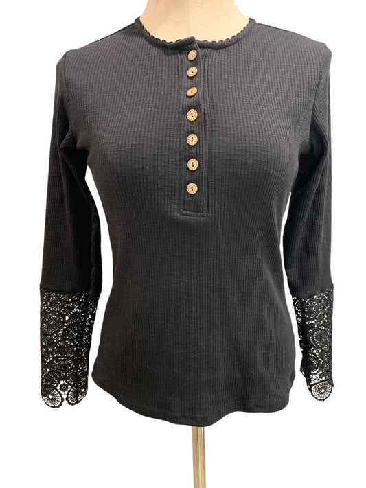 Small Unbranded Black Ribbed Womens Shirt Lace Trim Sleeve