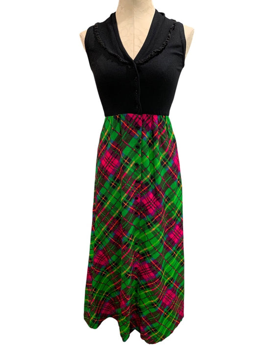 Small 1960s Vintage Bright Plaid Maxi Dress Button Up Sleeveless