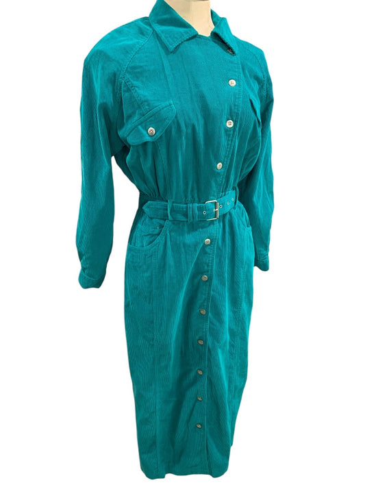 Size 8 Missy QPS Vintage 1980s Teal Corduroy Shirt Dress Retro Pockets