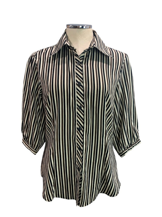 Large Ninety Womens Brown Black Striped Half Sleeve Button Up Blouse