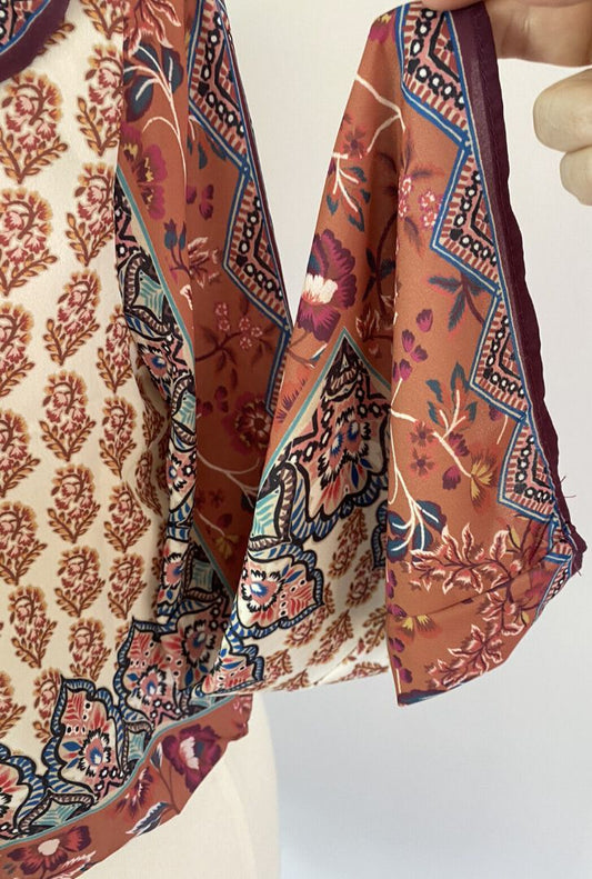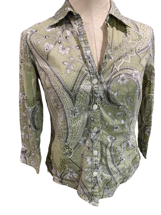 Size 6 Ann Taylor Women's Fitted Green Paisley Button Up Shirt 3/4 Sleeve