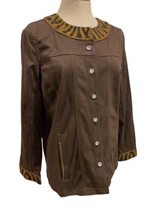 Small Quacker Factory Women's Brown Embellished Neckline Button Up Jacket New