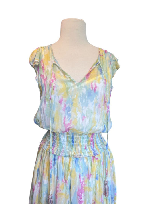 Size 8 Anthropologie Watercolor Print Spring Sleeveless Maxi Dress Lined Elastic Waist Tassle Ties