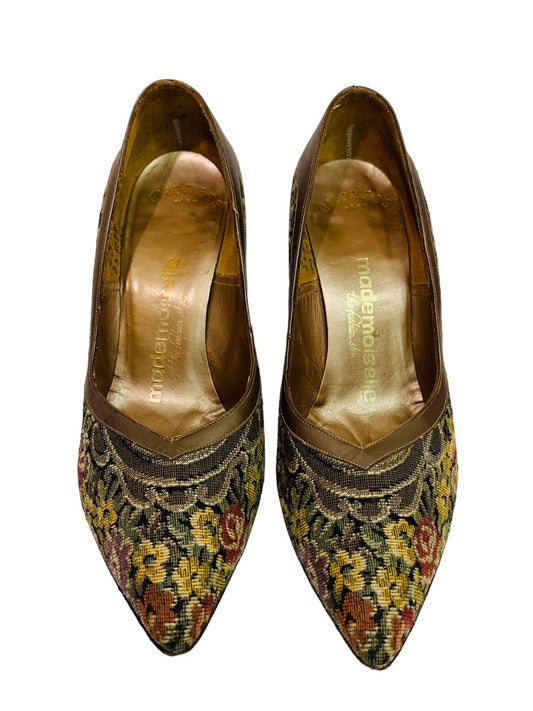 Size 5 Mademoiselle Women's Tapestry and Leather Heels 1960s Vintage