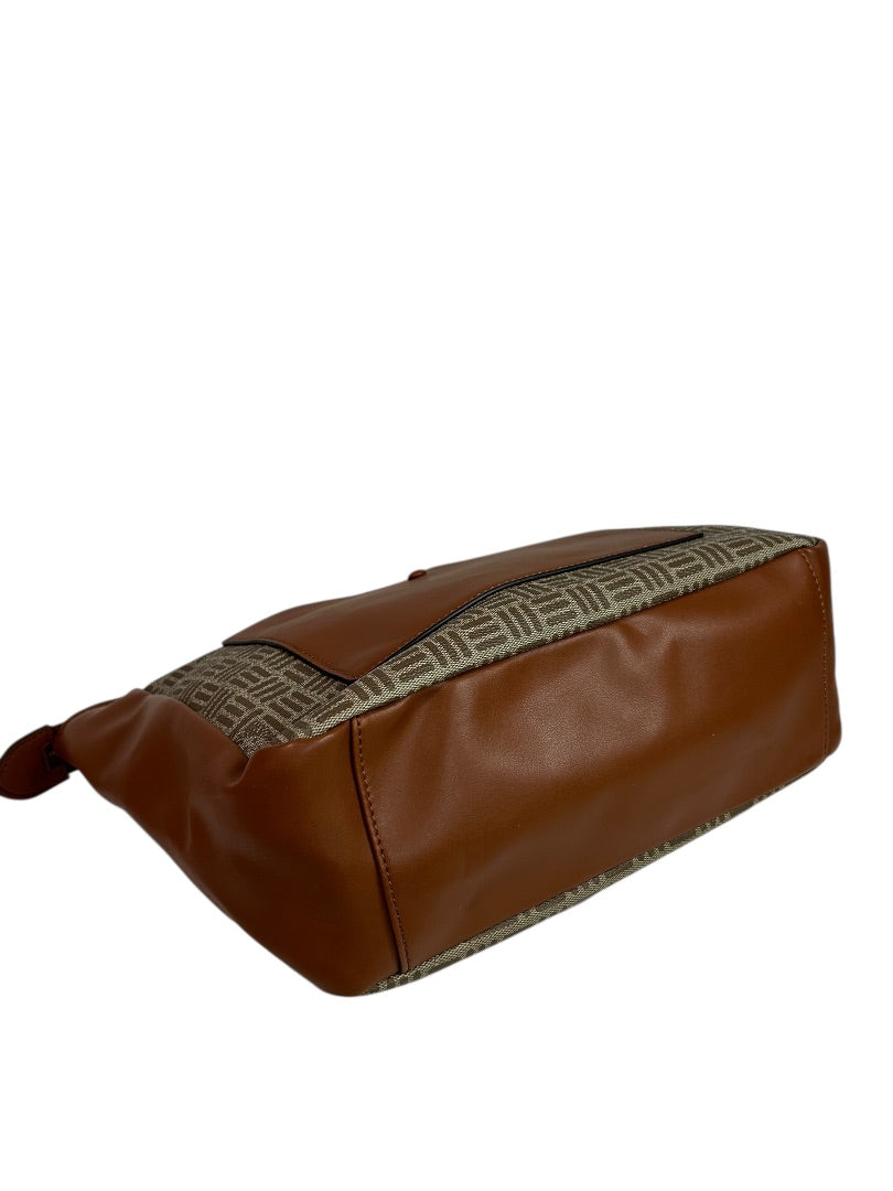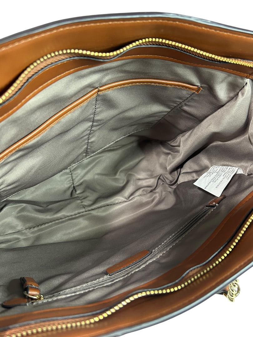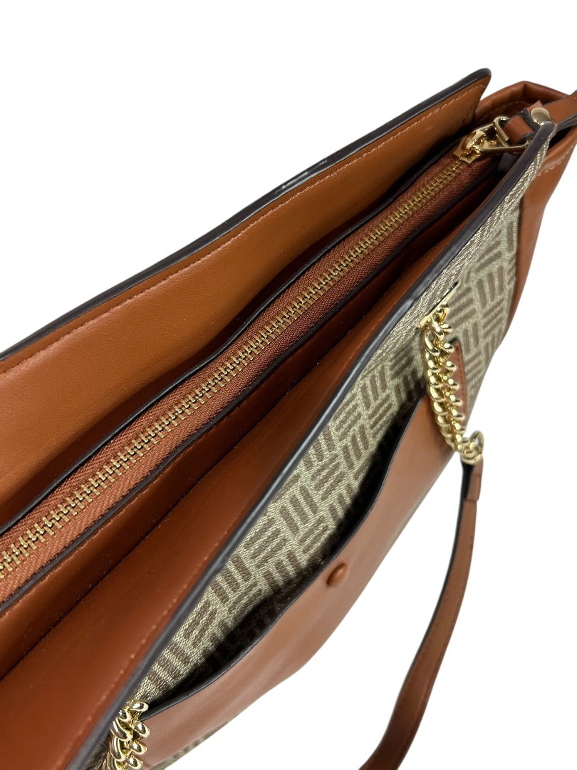 Anne Klein Tote Bag Brown Tan Monogram Chain Strap Purse Zip Pocket Logo