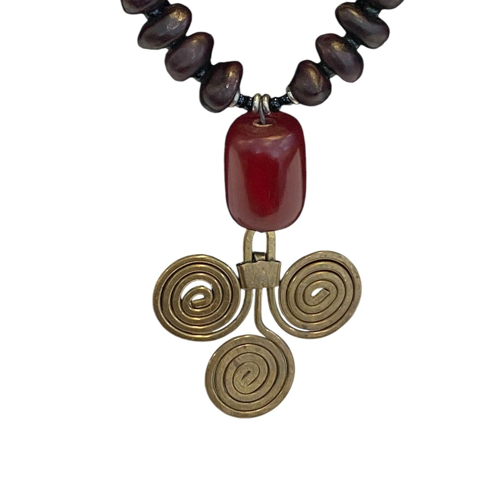 Brass Amber Color Pendant Necklace Handmade Africa Beaded 20”