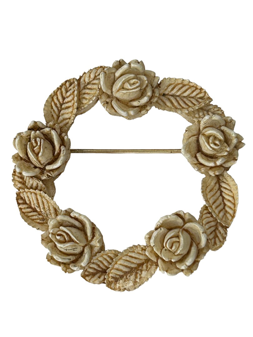 Brooch Pin Vintage 1960s Resin Rose Wreath Antiqued White 2" Diameter