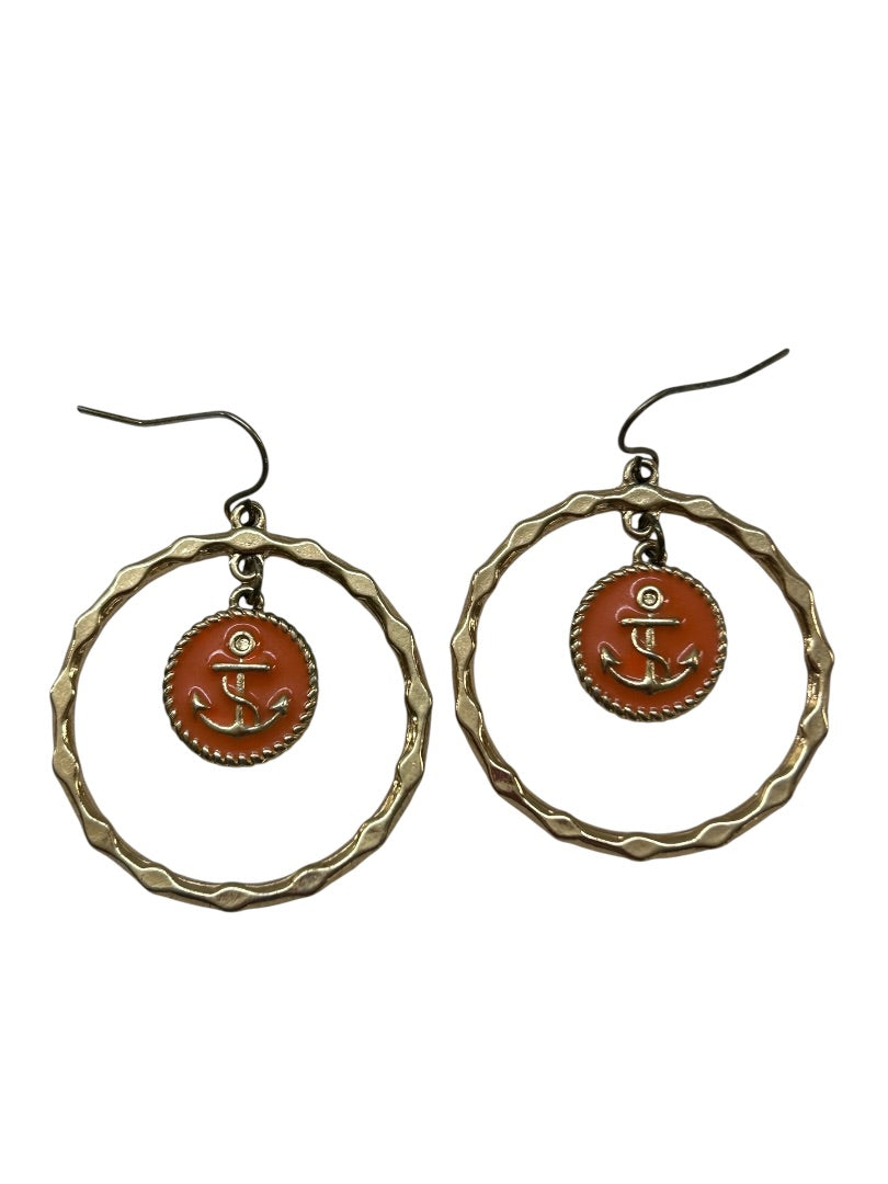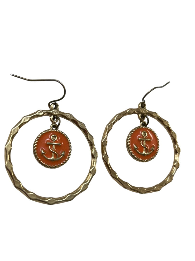 Goldtone Fishhook Pierced Earrings Nautical Anchor Enameled. 1.75" Drop