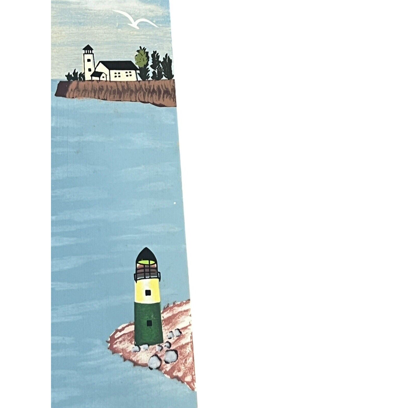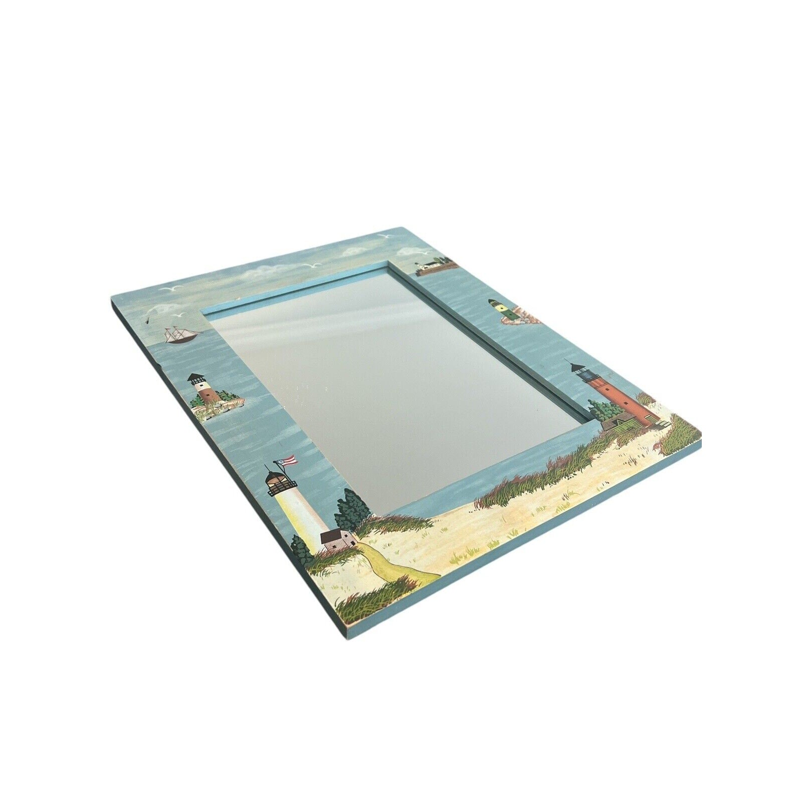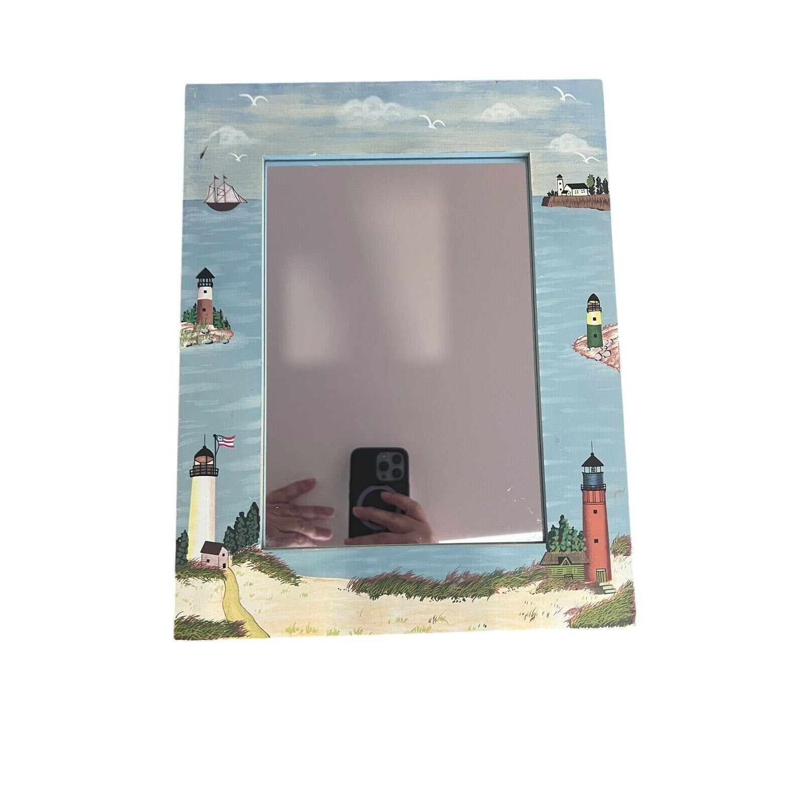 Hand Painted Wall Mirror Light House Wood Blue Handpainted Vintage 14” X 11”