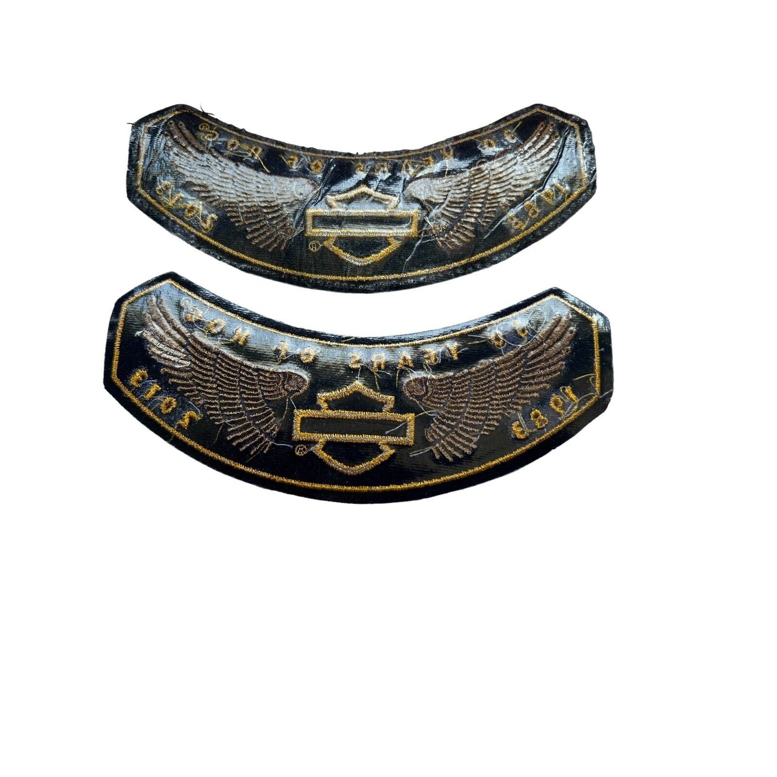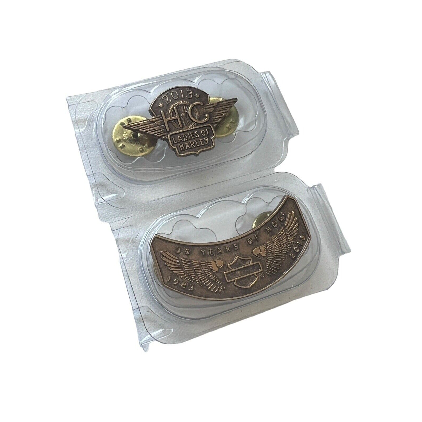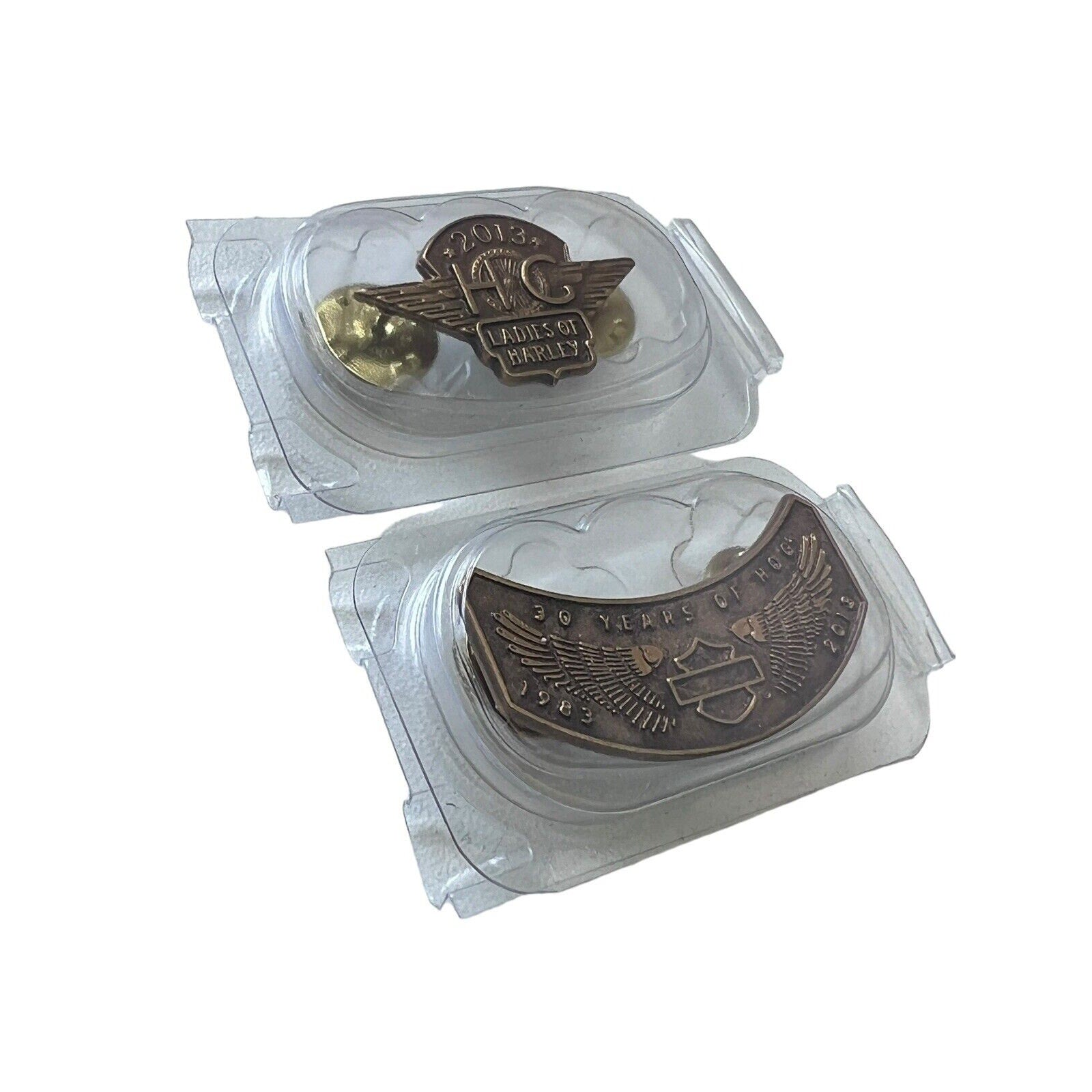 This set includes 2 iron on patches, one winged pin and one 2013 ladies of Harley pin.
