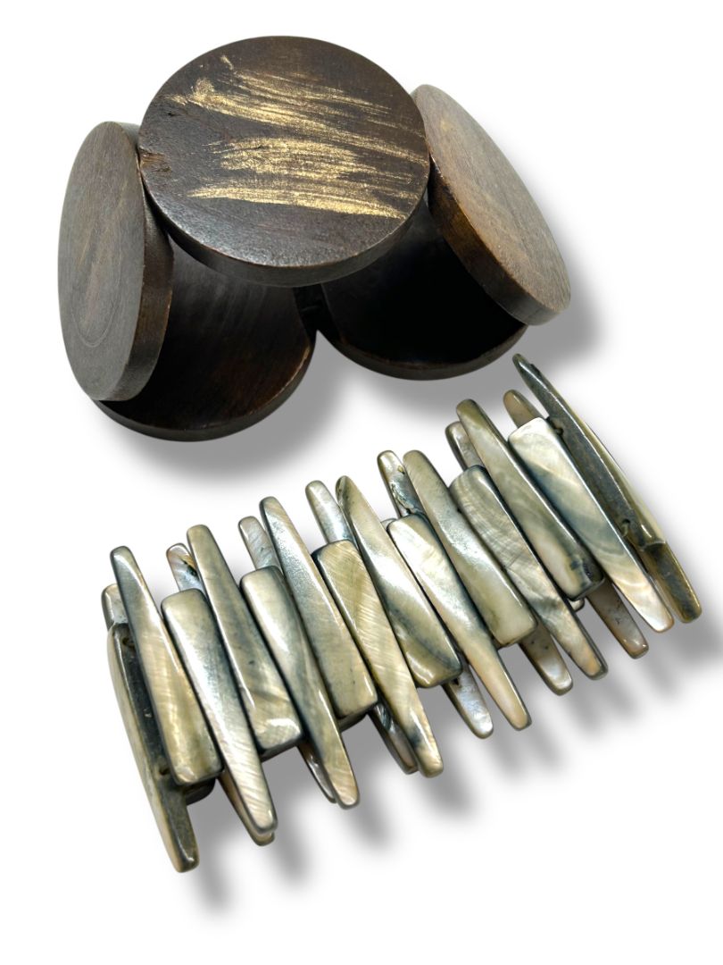 Lot of 2 Stretch Bracelets Boho Style Wooden Circle Spikey Shell Vintage