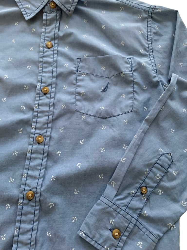 Medium (10/12) Nautica Boys Youth Long Sleeve Blue Button Down Anchor Print