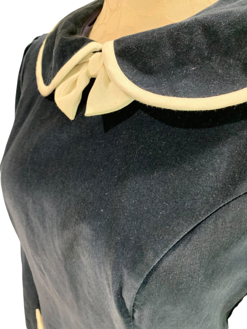 Medium Vintage 1960s Velvet Dress Navy Blue Ivory Box Trim