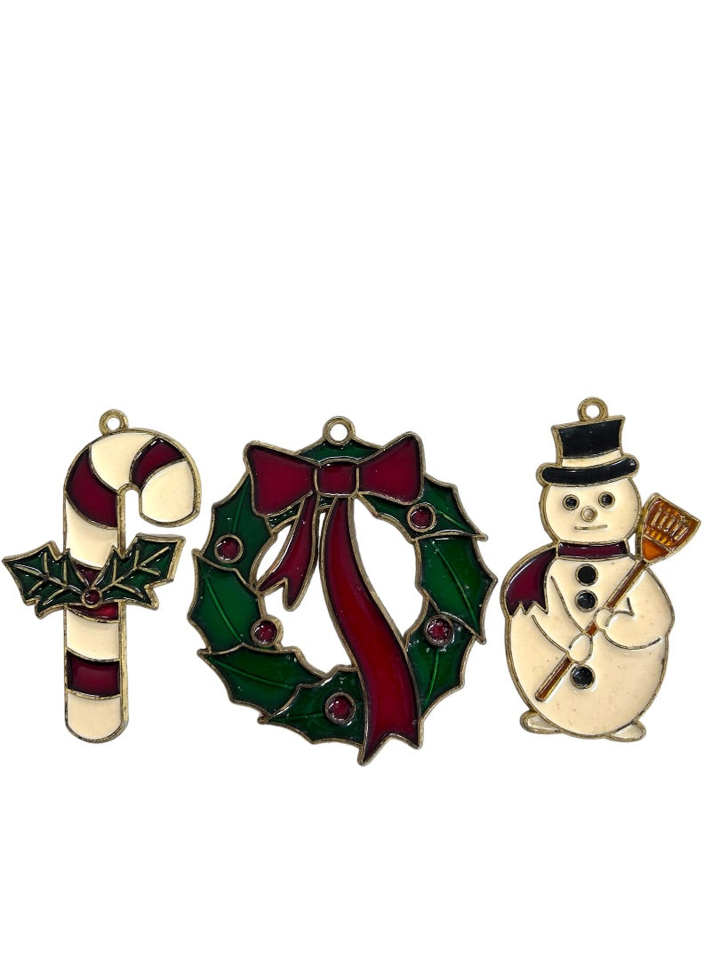 Set of 3 Stained Glass Holiday Ornaments Snowman Candy Cane Wreath