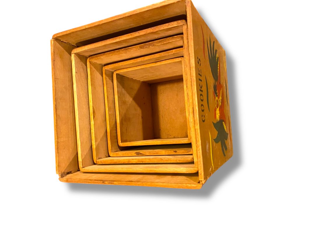 Set of 5 Nesting Wooden Canisters Vintage Rooster Cookies Flour Sugar Coffee Tea