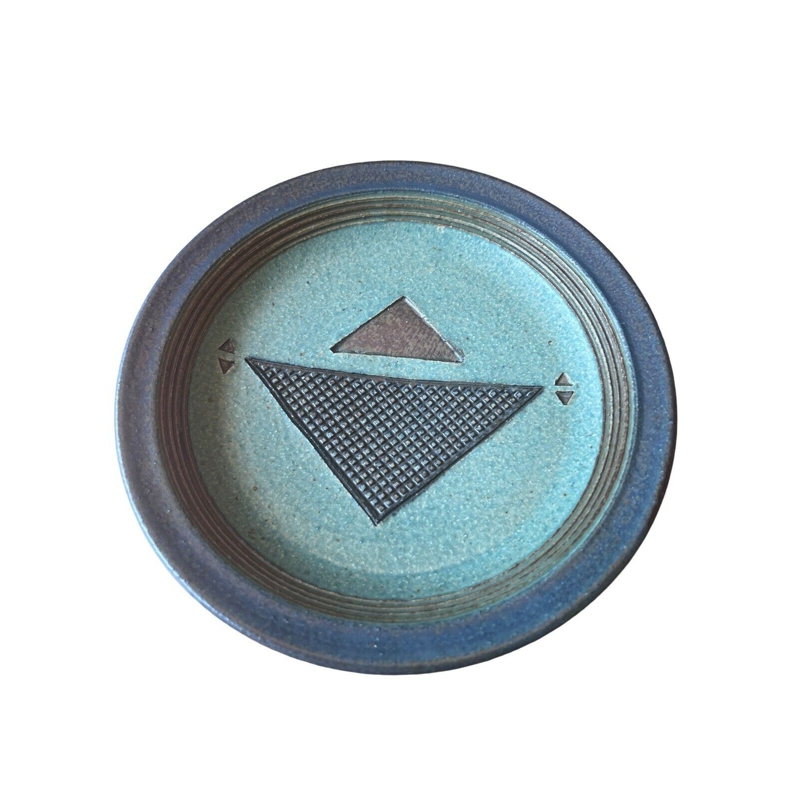 Signed Linda Sheard Pottery Blue Teal Plate Geometric Earth Glaze Handmade