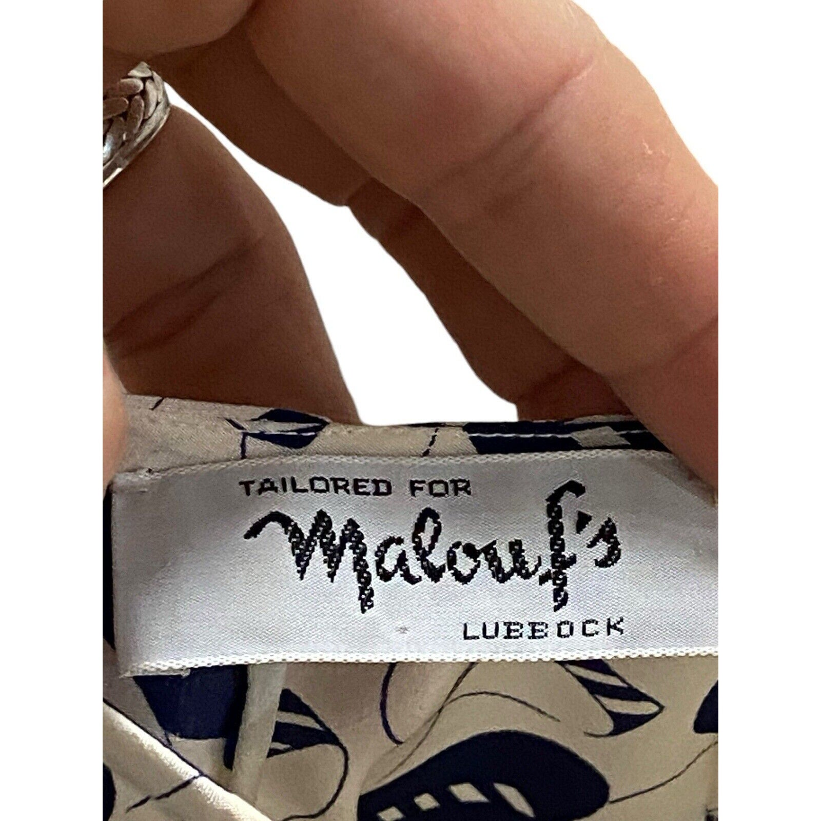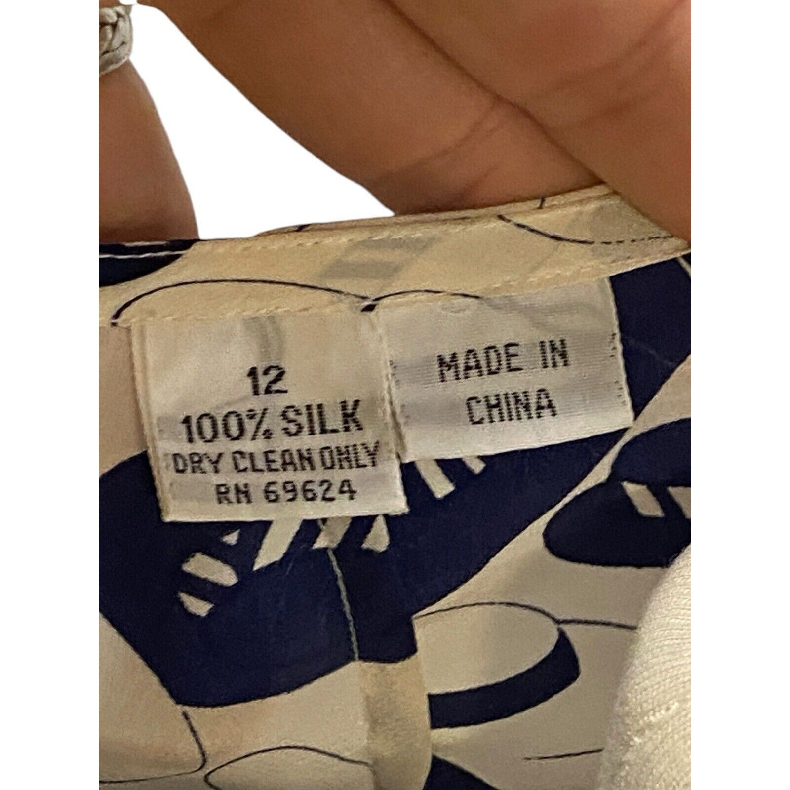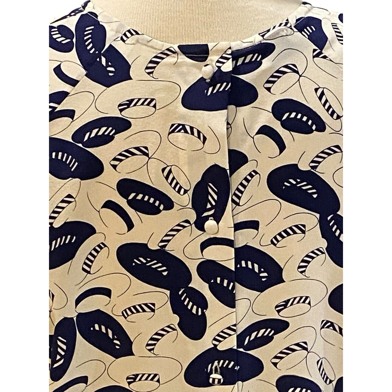 Size 12 Womens 100% Silk Blue Hat Print Fun Pullover Blouse Travel Wear Malouf’s