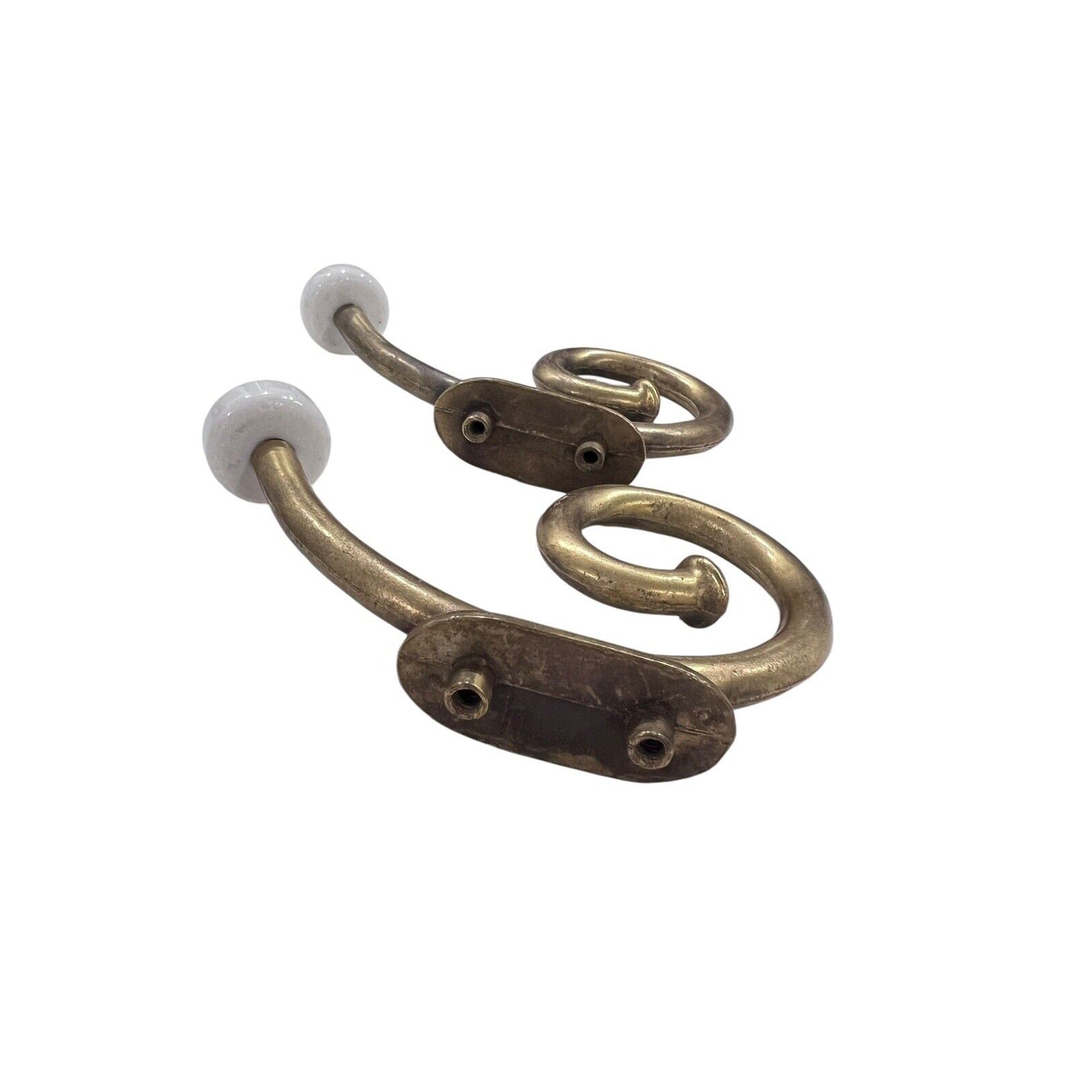 Vintage Brass Hook Rack White Ceramic Knob Coat Hat Towel 5” Scroll B
