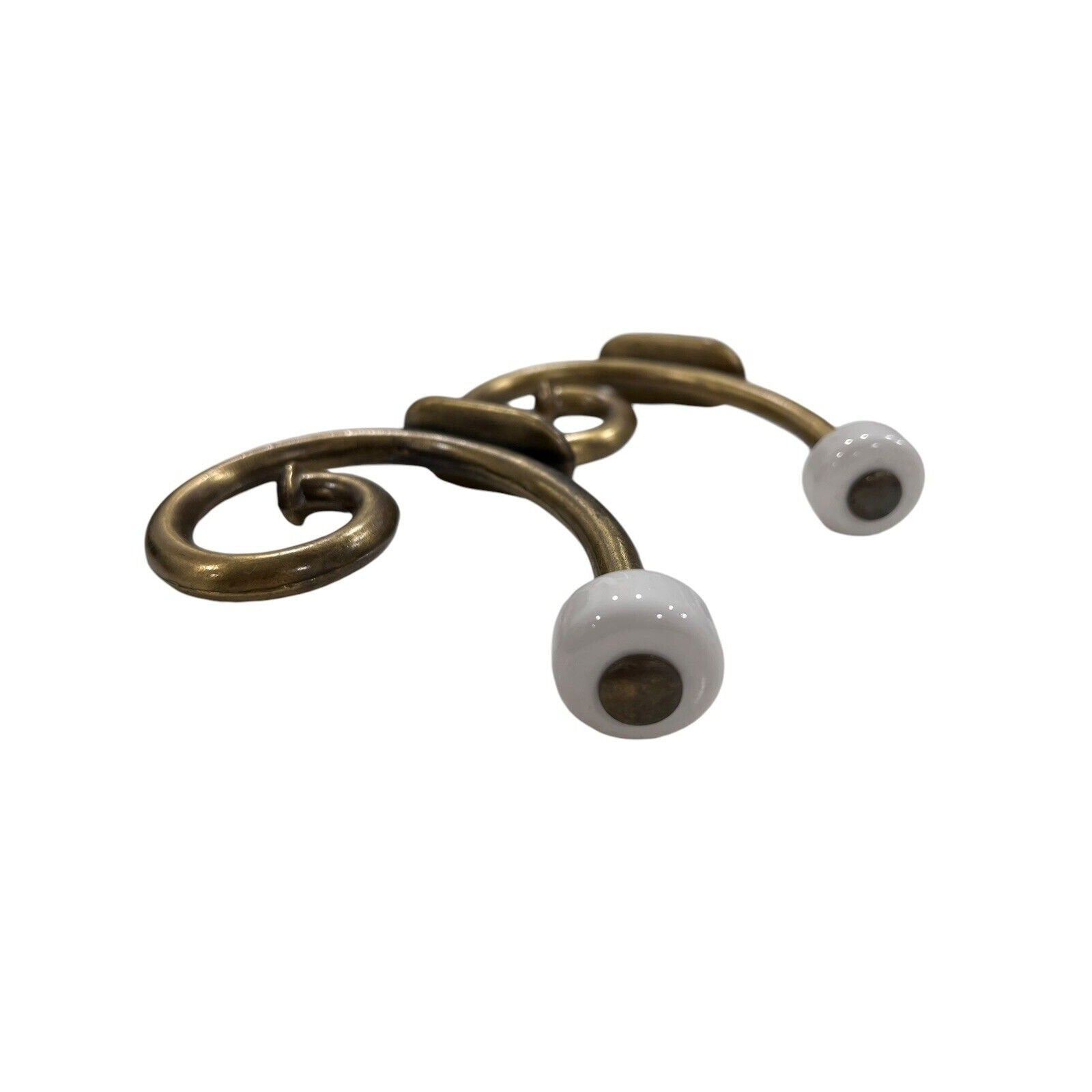 Vintage Brass Hook Rack White Ceramic Knob Coat Hat Towel 5” Scroll Dark Patina