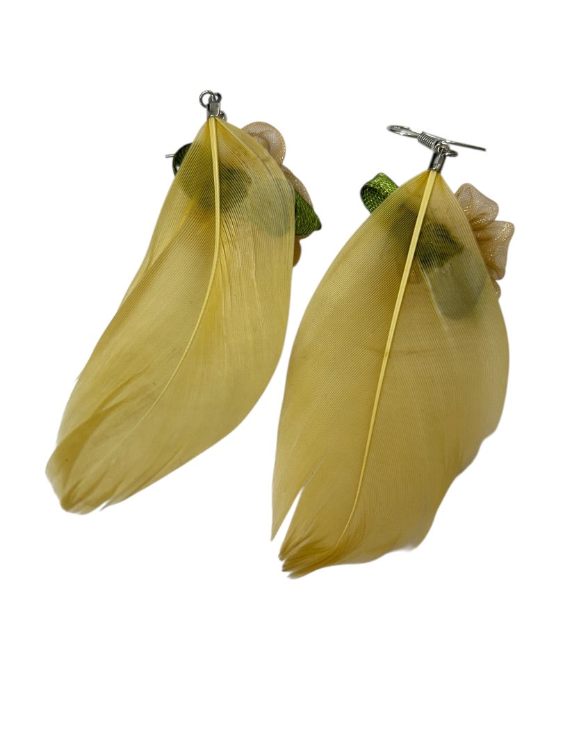 Vintage Fashion Earrings Fabric Feather Rose 3.5" Drop Fish Hook