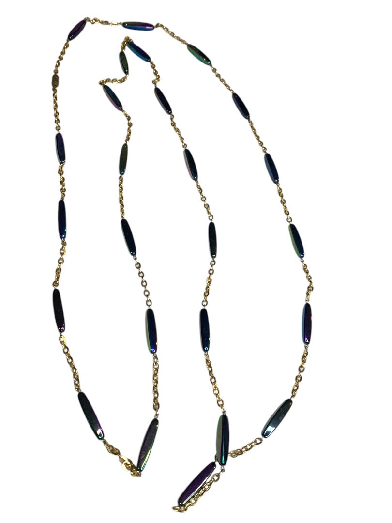 Vintage Goldtone Strand String Necklace 60 Inch Barrel Closure Purple Blue Green
