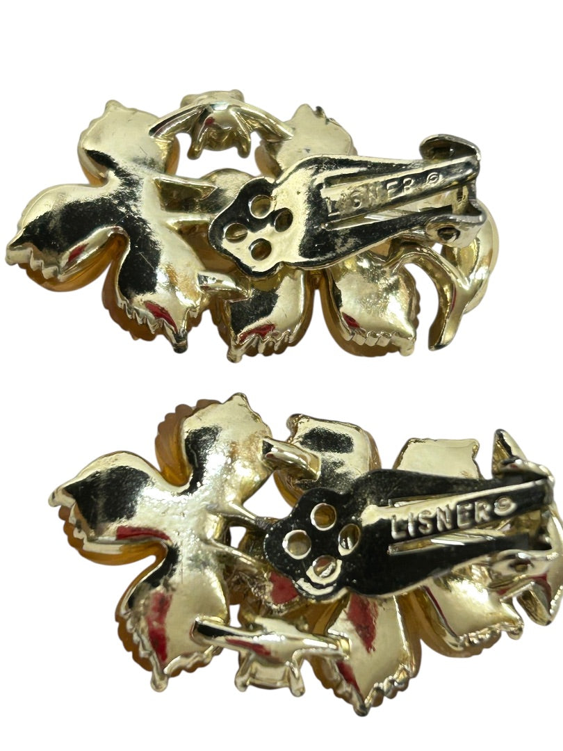 Vintage Signed Lisner Clip On Earrings Acrylic Amber Floral 1.5" Drop