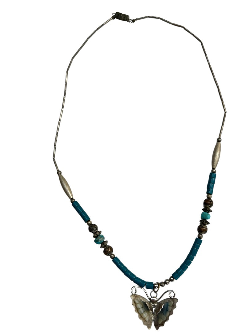 Vintage Silvertone Beaded Butterfly Pendant Necklace 19 Inch Barrel Clasp
