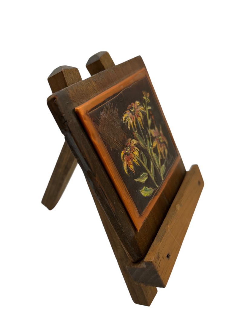 Vintage Small 4" x 6" Painting Signed Purdy on Copper Flowers on Easel