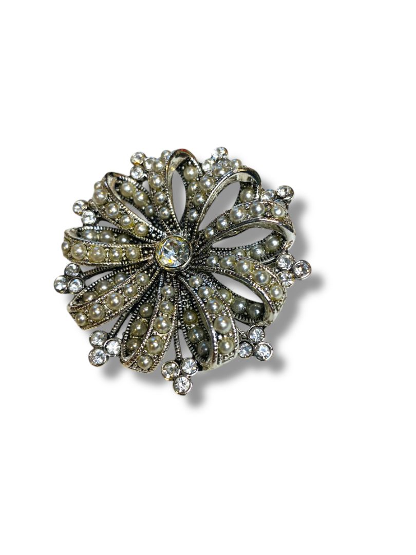 Vintage Sparkly Silvertone Faux Pearl Brooch Pin 2.1" Diameter