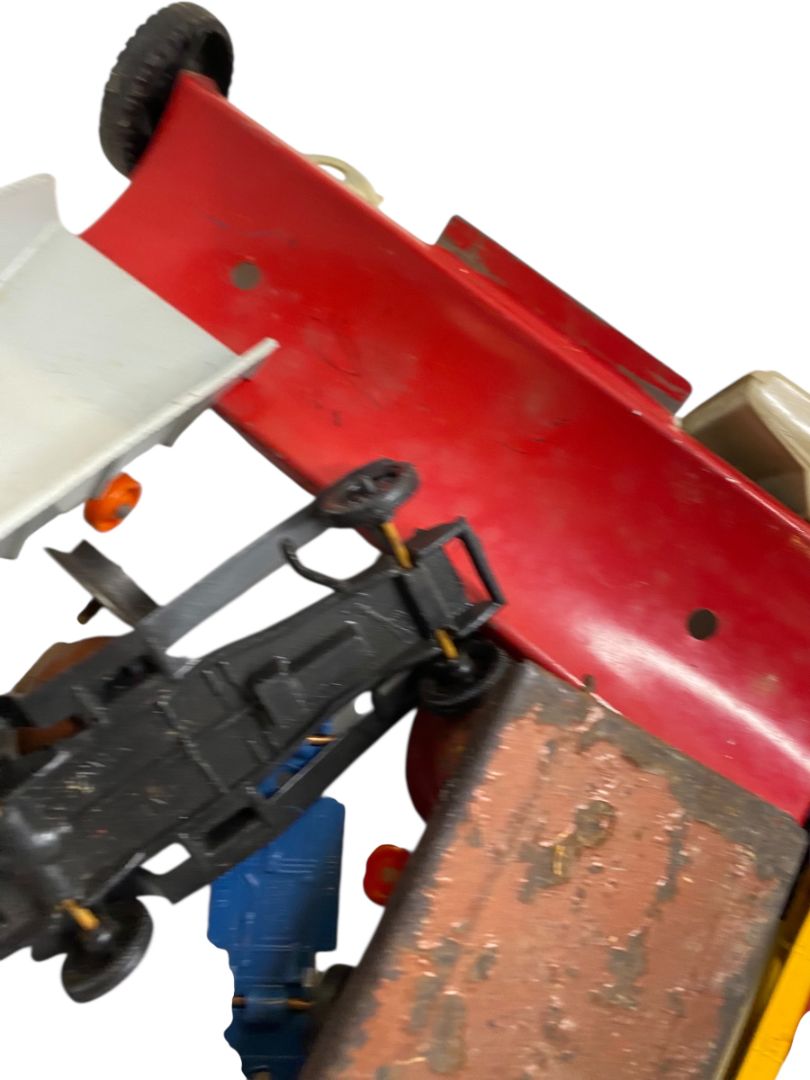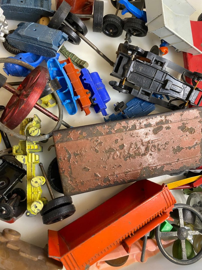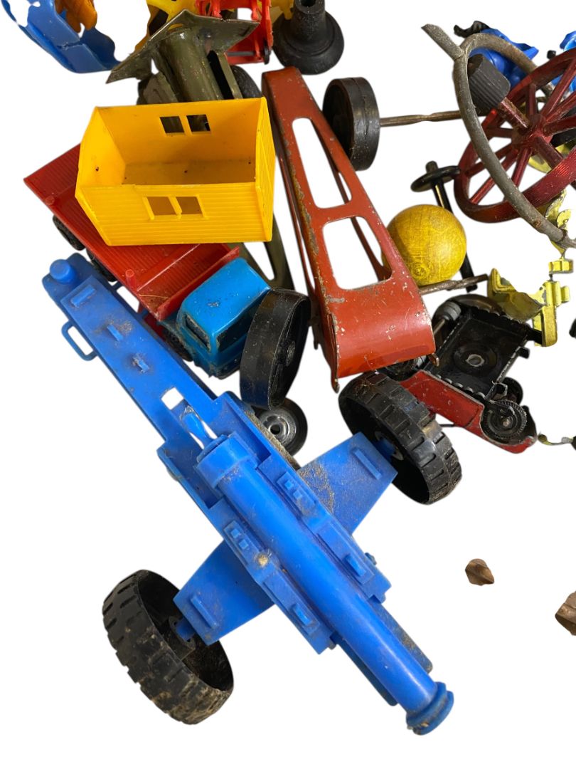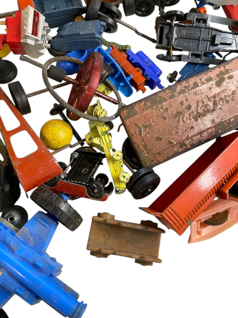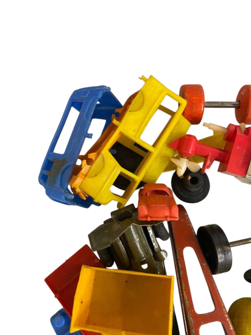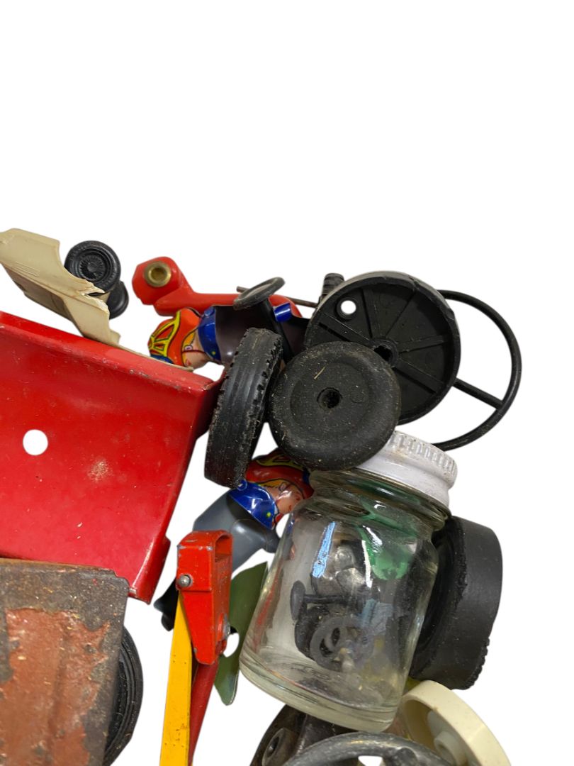 Vintage Toy Parts Pieces Scrap Junk Lot Wheels Hats Tires Plastic Tin