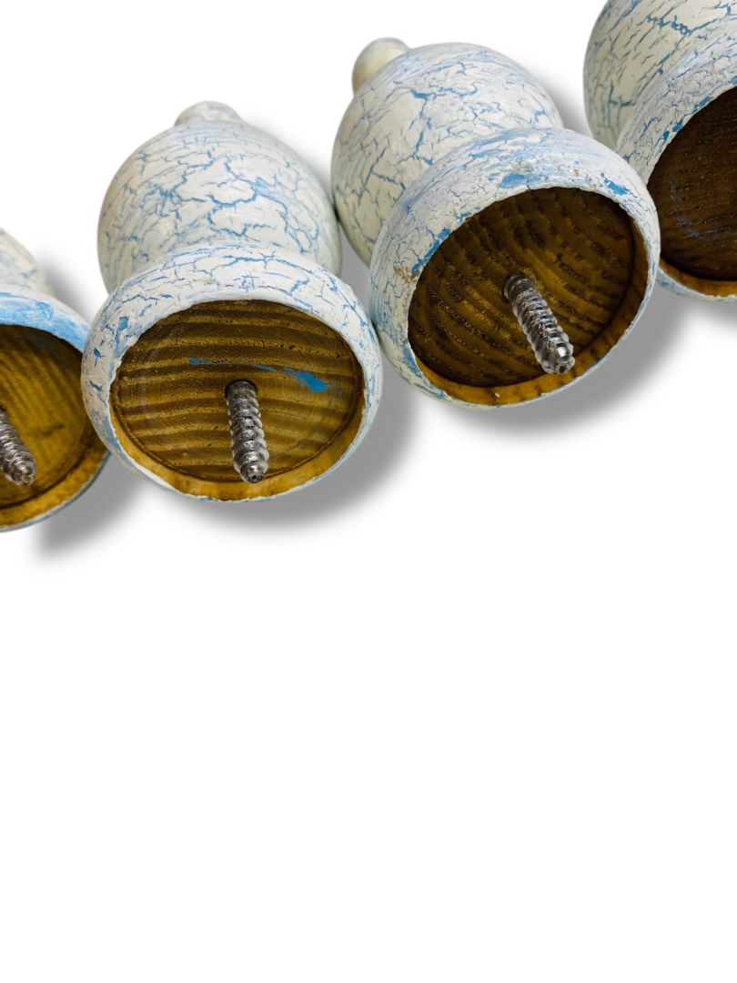 Vintage Wooden Set of 4 Finial Posts White Blue Crackle Paint 4.25" Screw In